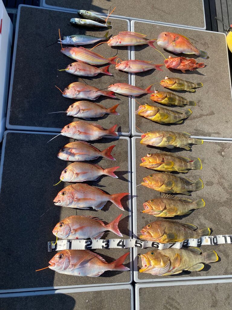 今日は5名のお客様で出港しました。下げ潮が動いてくれたので真鯛もアオナも釣れて良かったです。アオナの型が良かったですねー、最大は1.8kgでした。